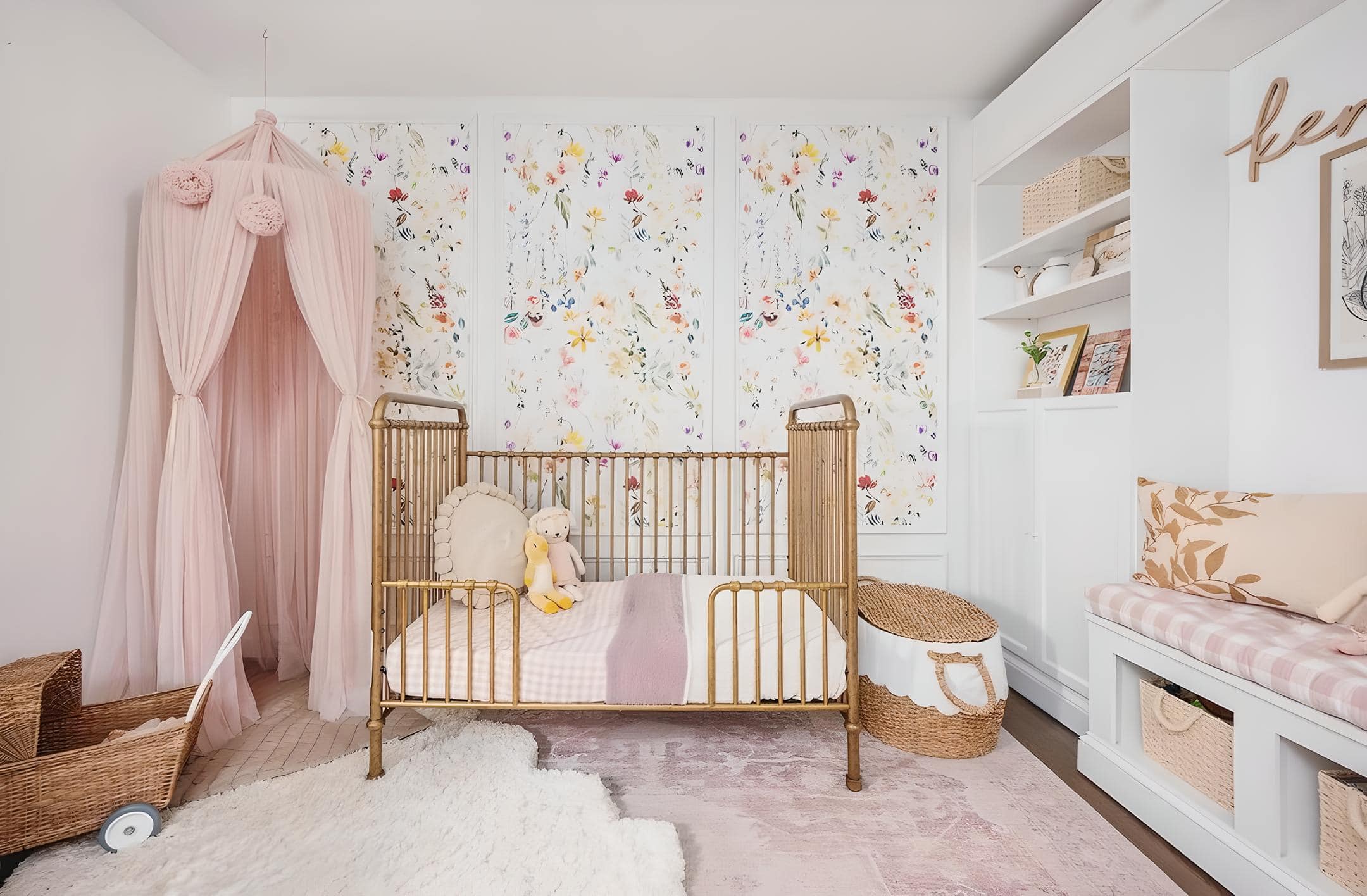 In this gorgeous floral nursery, three captivating wall panels are brought to life by enchanting floral wallpaper, effortlessly stealing the spotlight alongside the elegant gold metal crib. Adding a delightful touch of whimsy to the space is a charming pink canopy nestled in the corner.