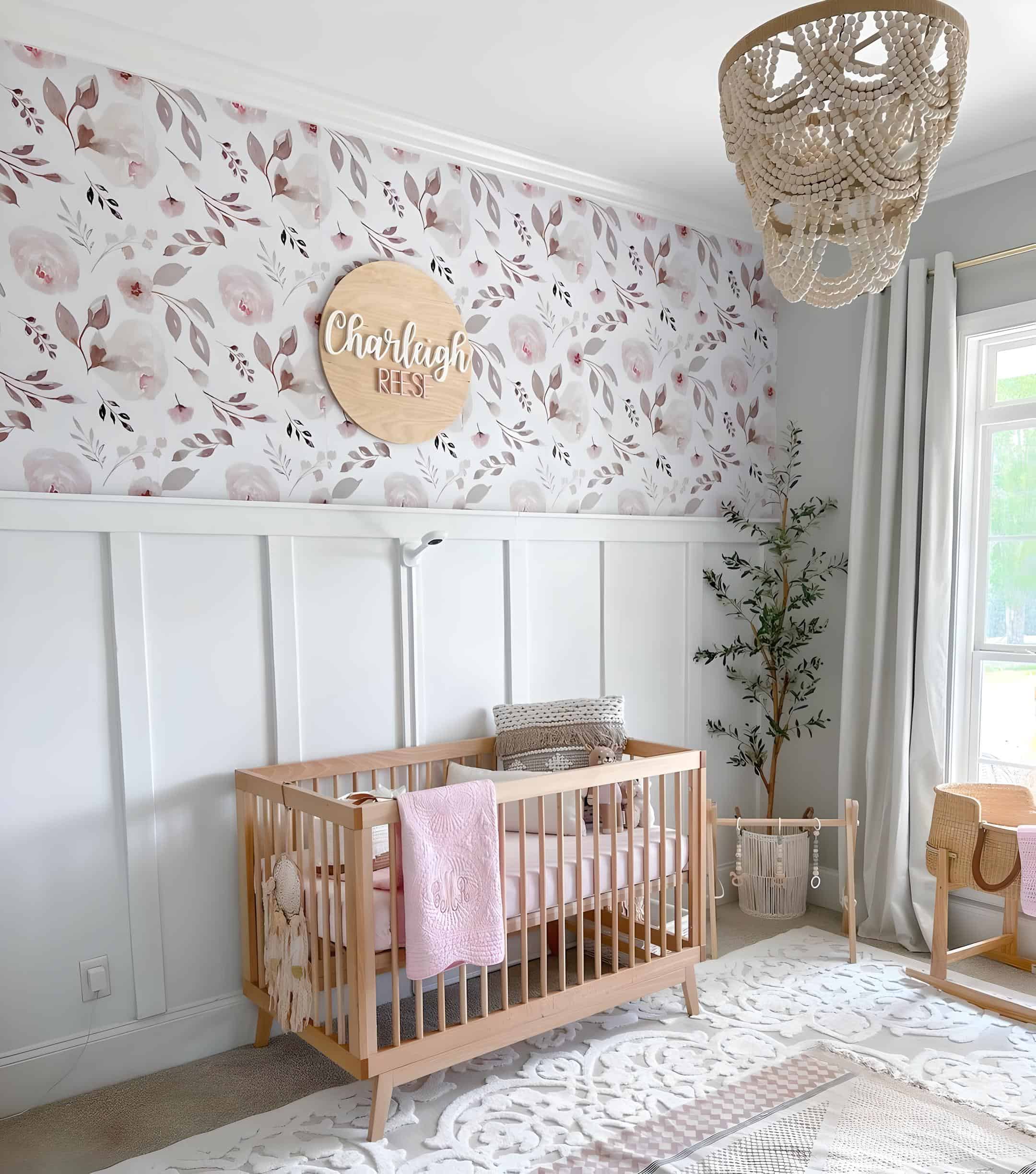 We adore the impeccable organization of this nursery, where every element, from the crib to the furniture, is thoughtfully arranged for optimal functionality. A soft pink floral mural graces the wall above the white panels, adding a delicate touch of nature. Rather than centering the crib, the parents have chosen to position the washed gray crib slightly off-center, leaving room for a fiddle leaf tree, a glider, and a nightstand. Completing the ensemble, the oriental pink and gray rug adds the perfect finishing touch.