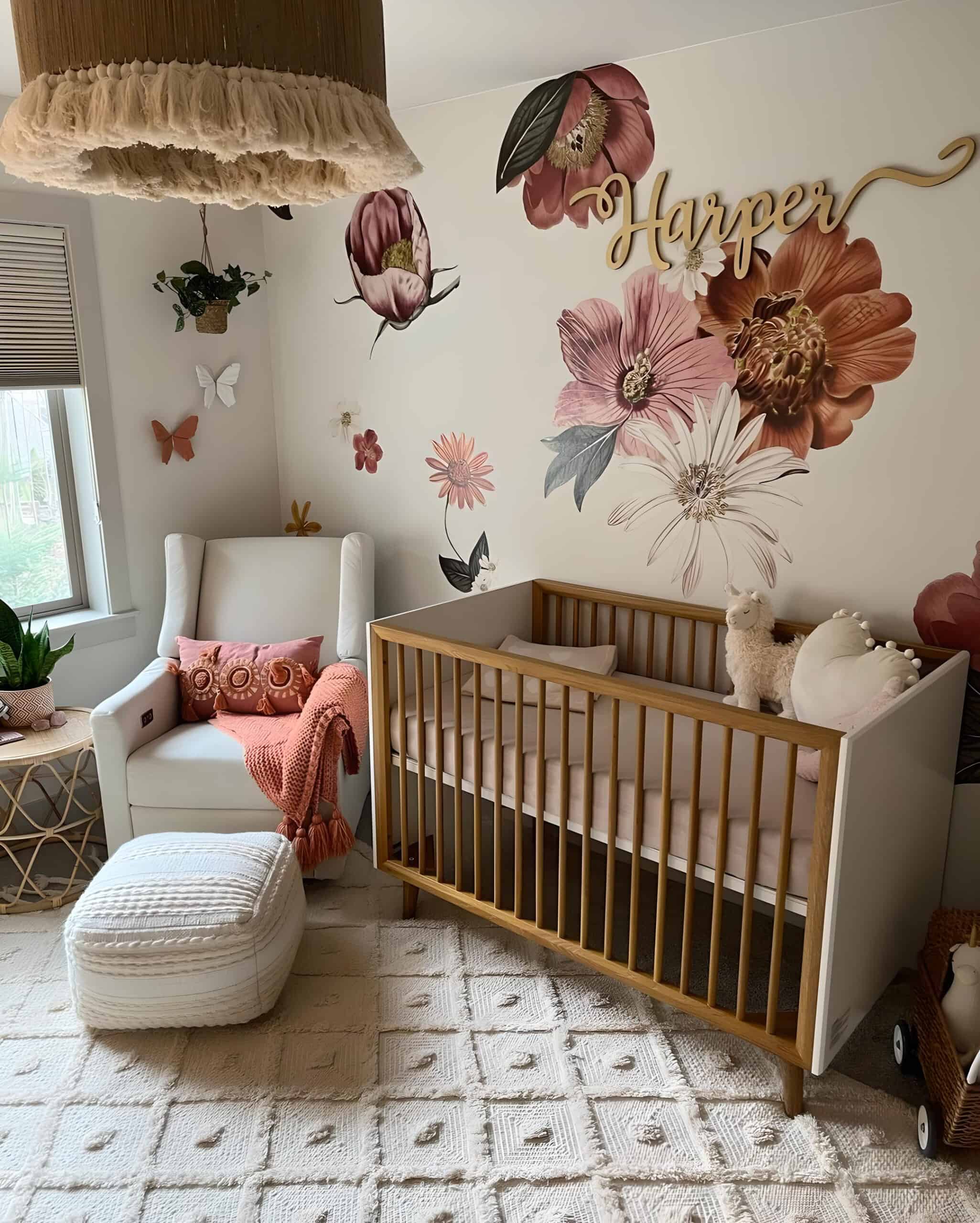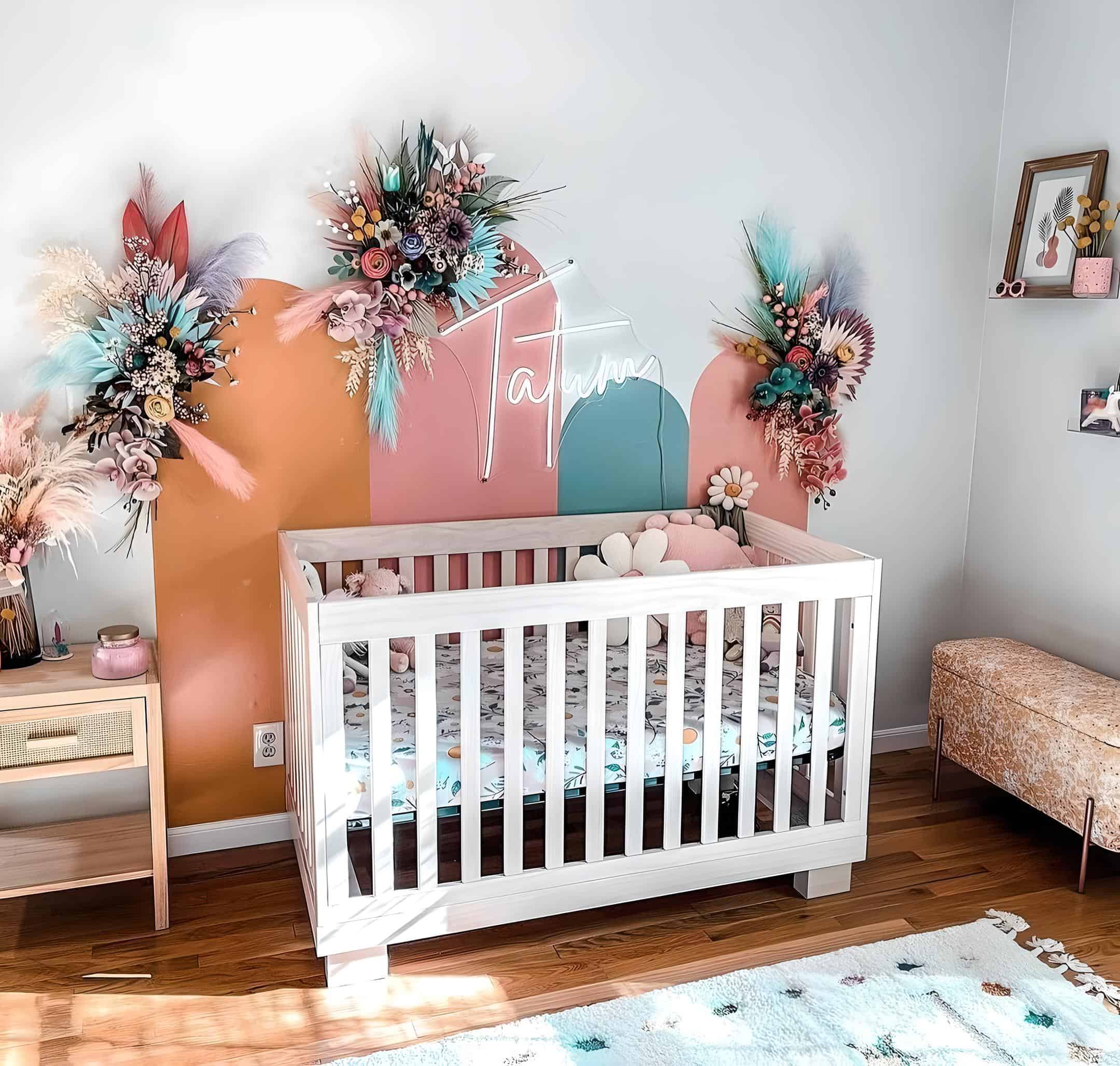 This nursery achieves a flawless fusion of floral decals and earthy hues. With decal colors spanning from rich purples to deep oranges, a cohesive design emerges, beautifully complementing the natural wood crib and earthy boho accents, resulting in a harmonious and inviting atmosphere.
