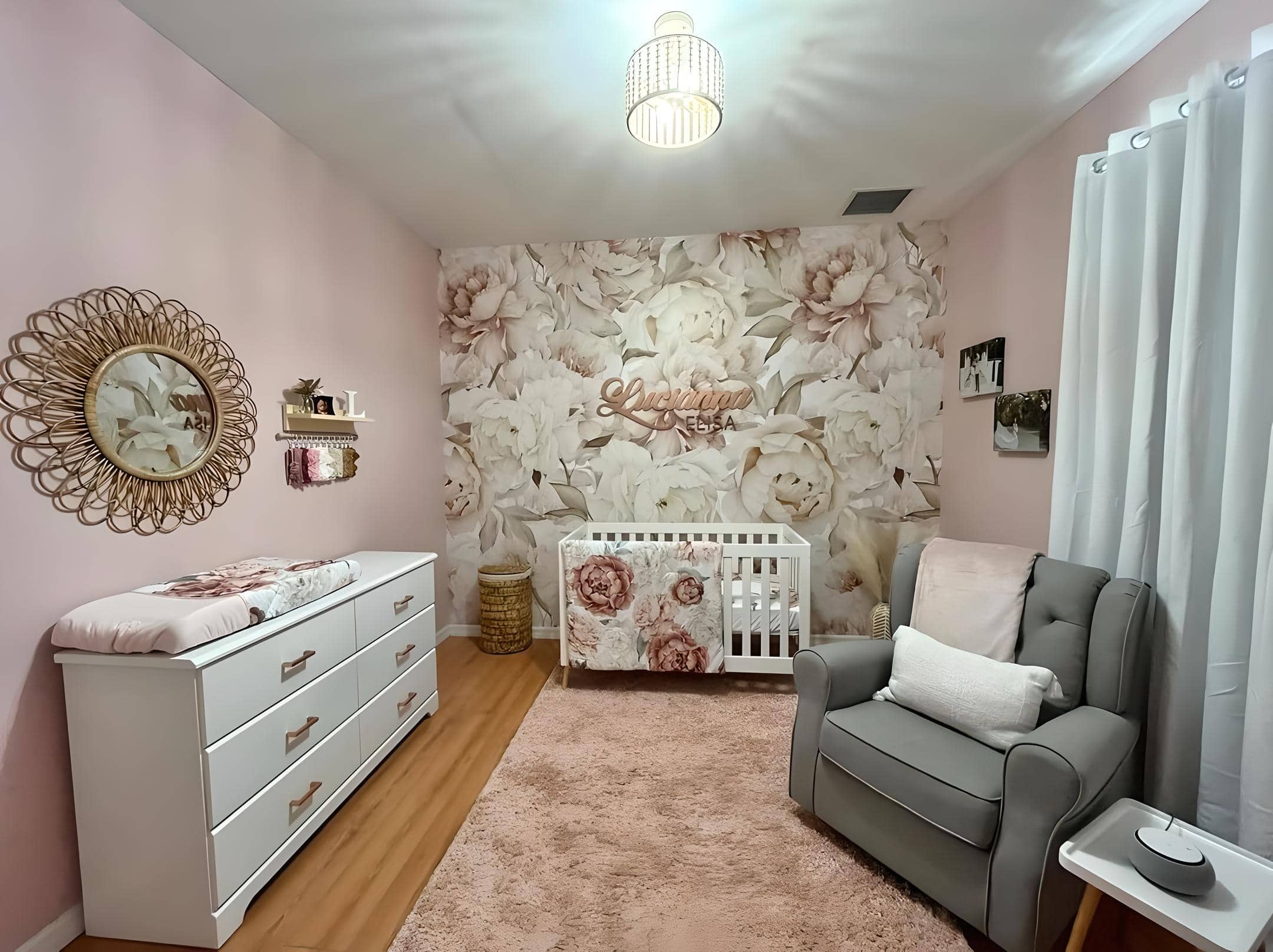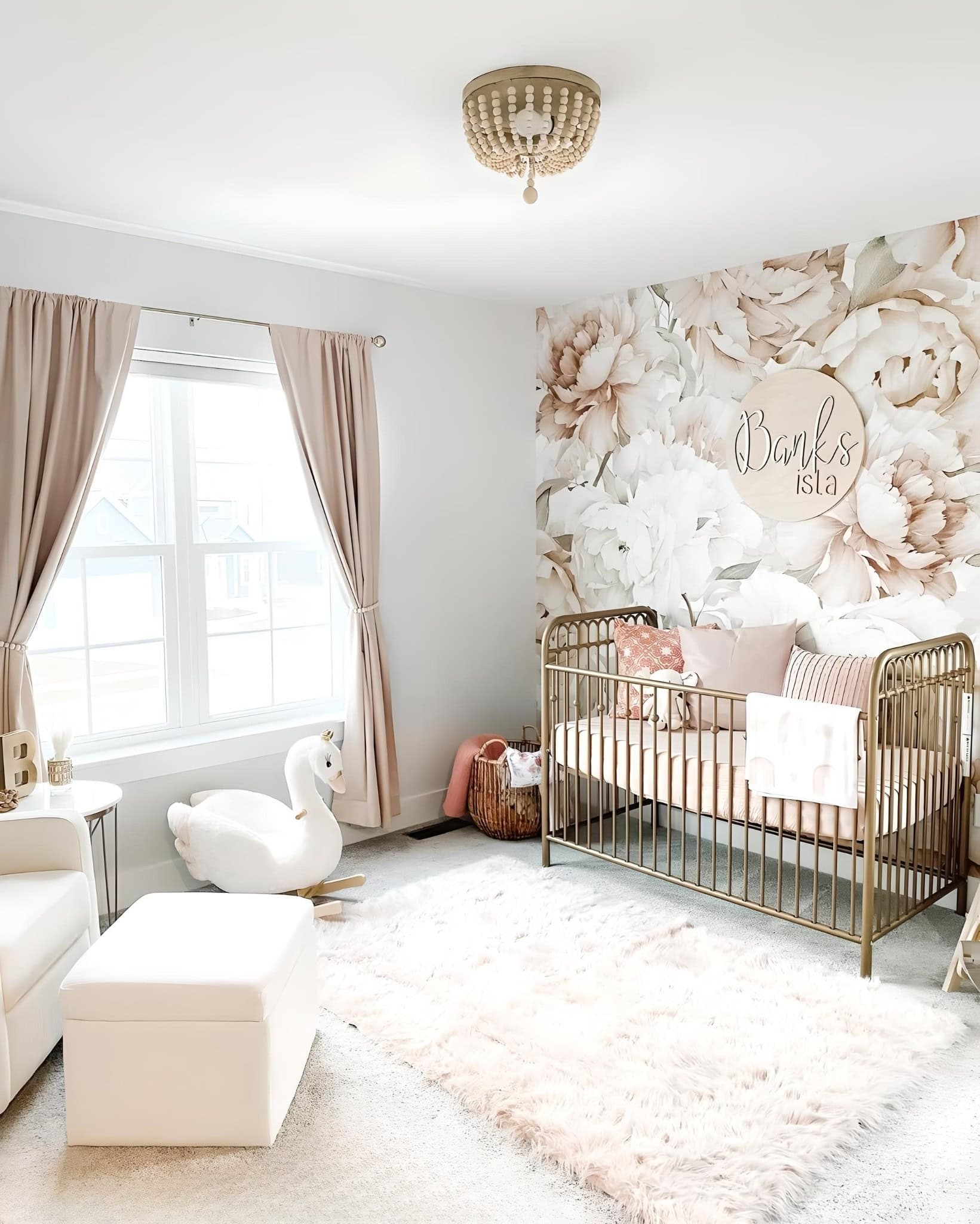 Bank’s nursery is a serene, refined sanctuary, exuding an aura of elegance. Adorned with a white and blush pink peony wall mural that harmonizes beautifully with the blush pink sheepskin rug, curtains, and the beige glider, every element contributes to the tranquil atmosphere. The gold metal crib stands out as a cherished choice among floral nursery themes, adding a touch of sophistication to the space.