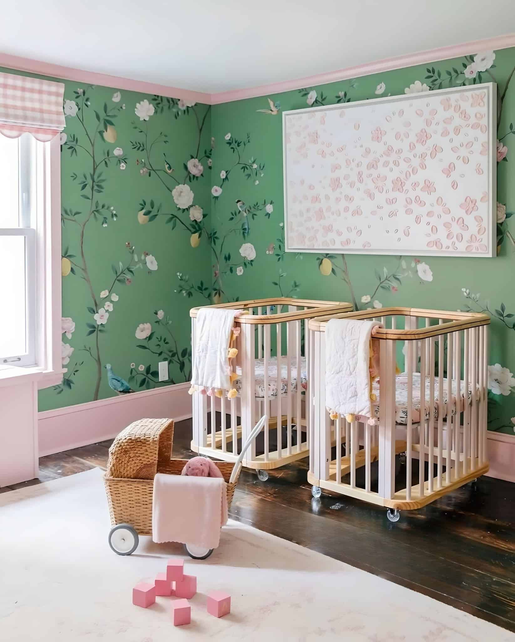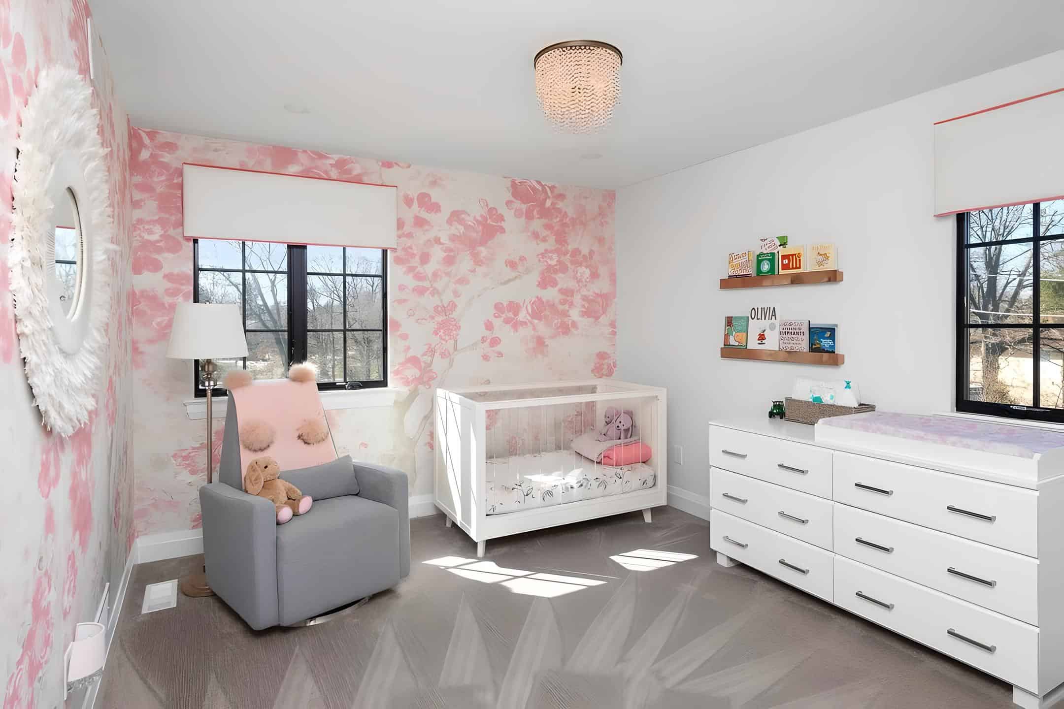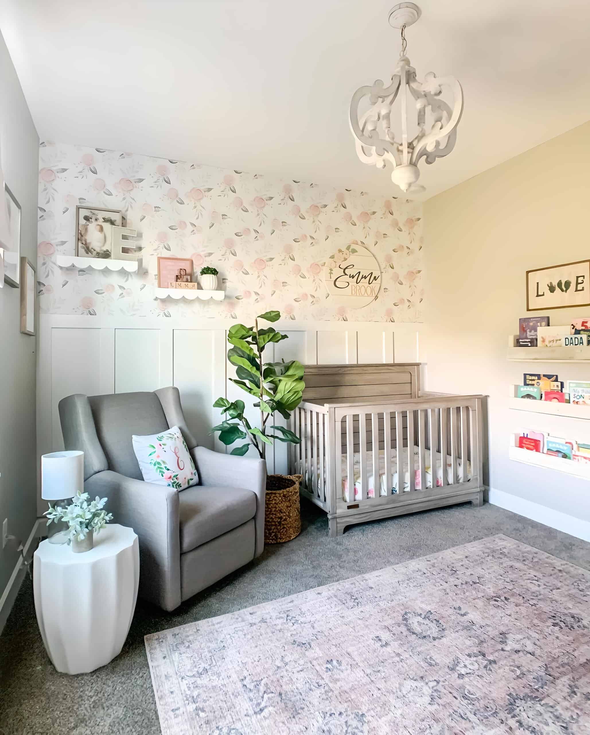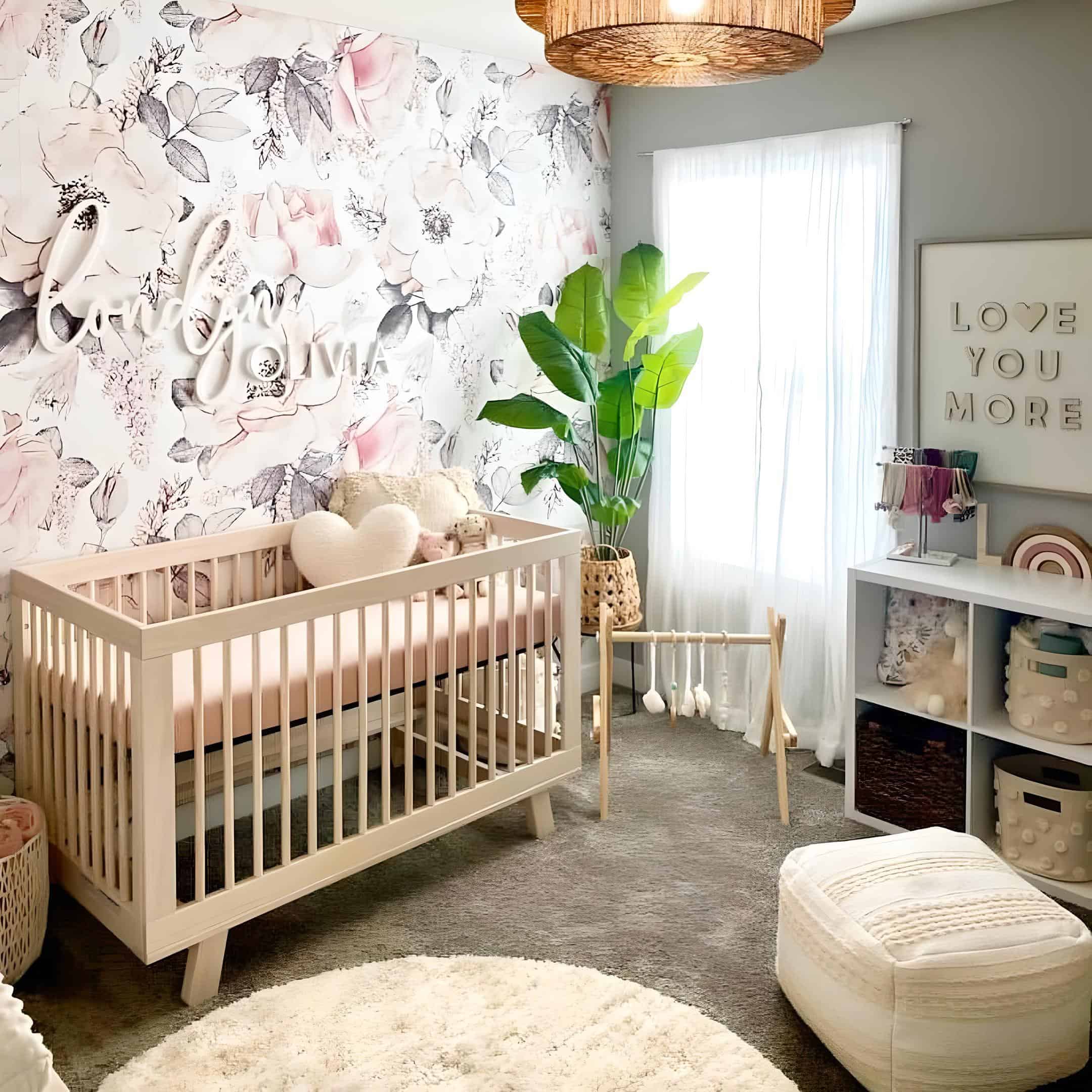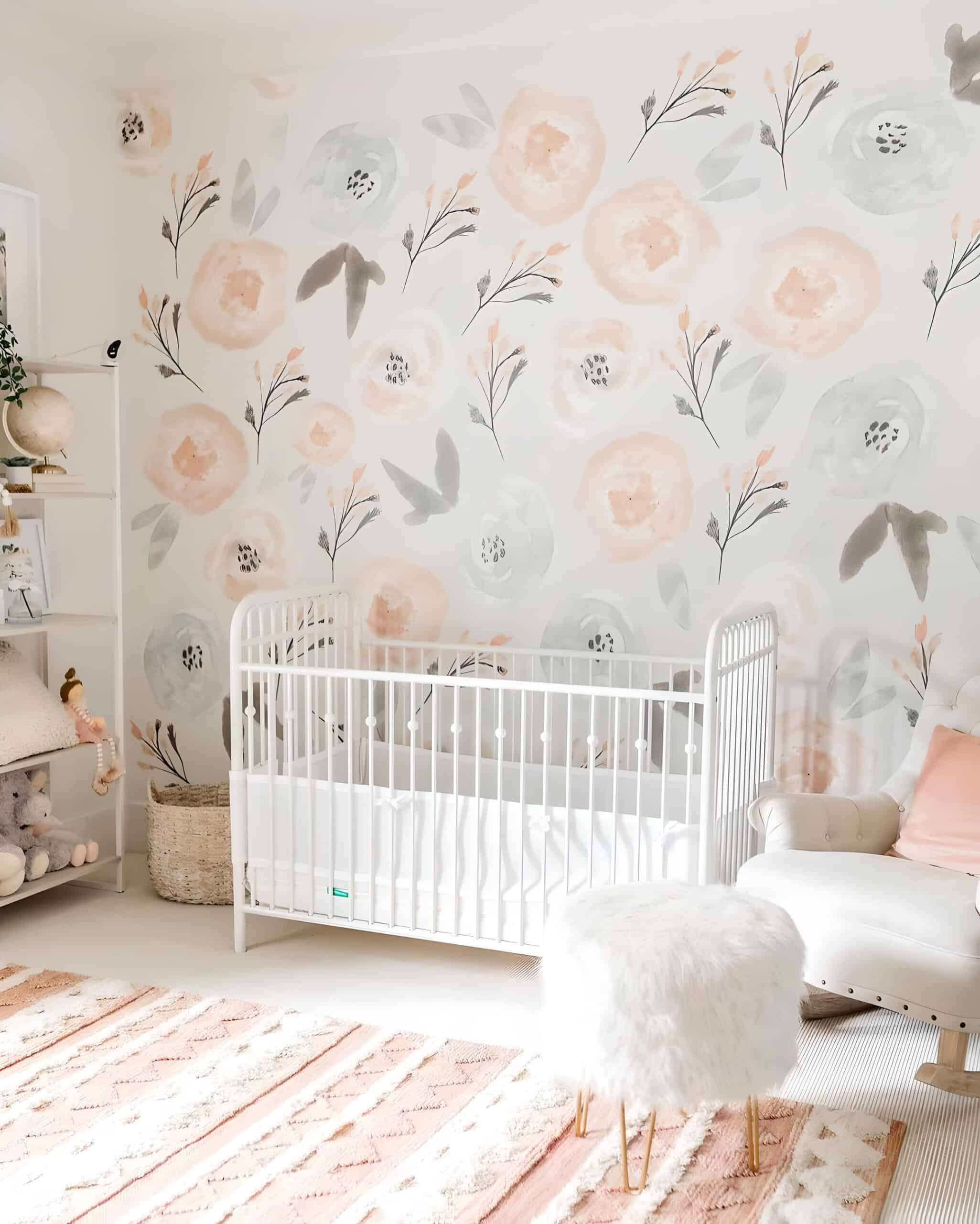 This nursery makes a bold statement with its captivating full-wall floral mural, serving as the centerpiece of this charming baby girl’s room. The harmonious fusion of gray and blush pink hues creates a tranquil atmosphere, while the presence of floral vases beautifully complements the enchanting theme. It’s no wonder that this floral wallpaper is a favorite among floral nursery ideas.