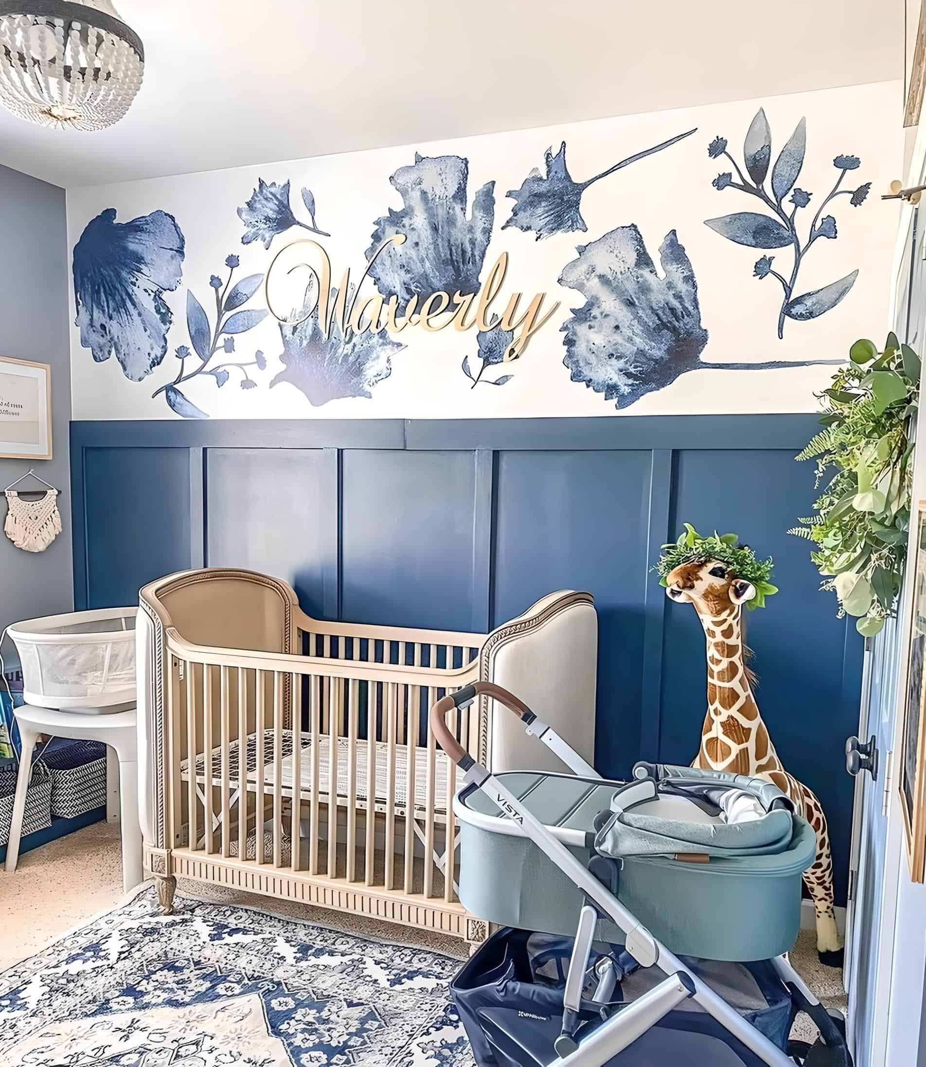 It’s always exciting when expectant parents dare to explore non-traditional color schemes for their baby’s nursery. The striking navy blue panel wall instantly captivates, harmonizing beautifully with delicate blue watercolor floral decals and other complementary blue accents throughout the space. The luxurious Belle upholstered crib from RH Baby maintains its position as the focal point, anchoring the room with its high-end allure. To finish off the look, an oriental rug featuring a navy blue pattern adds a touch of sophistication and completes the ensemble.