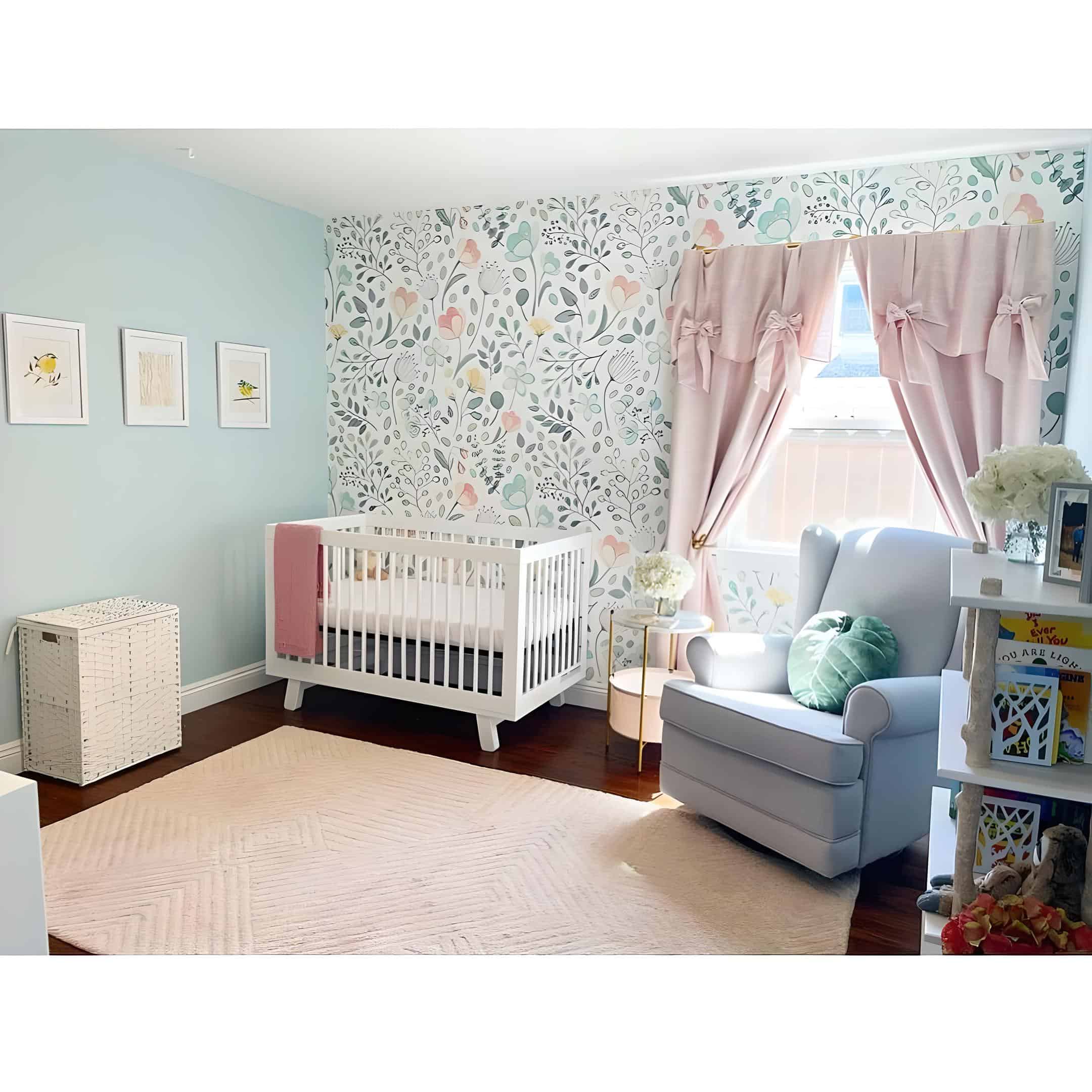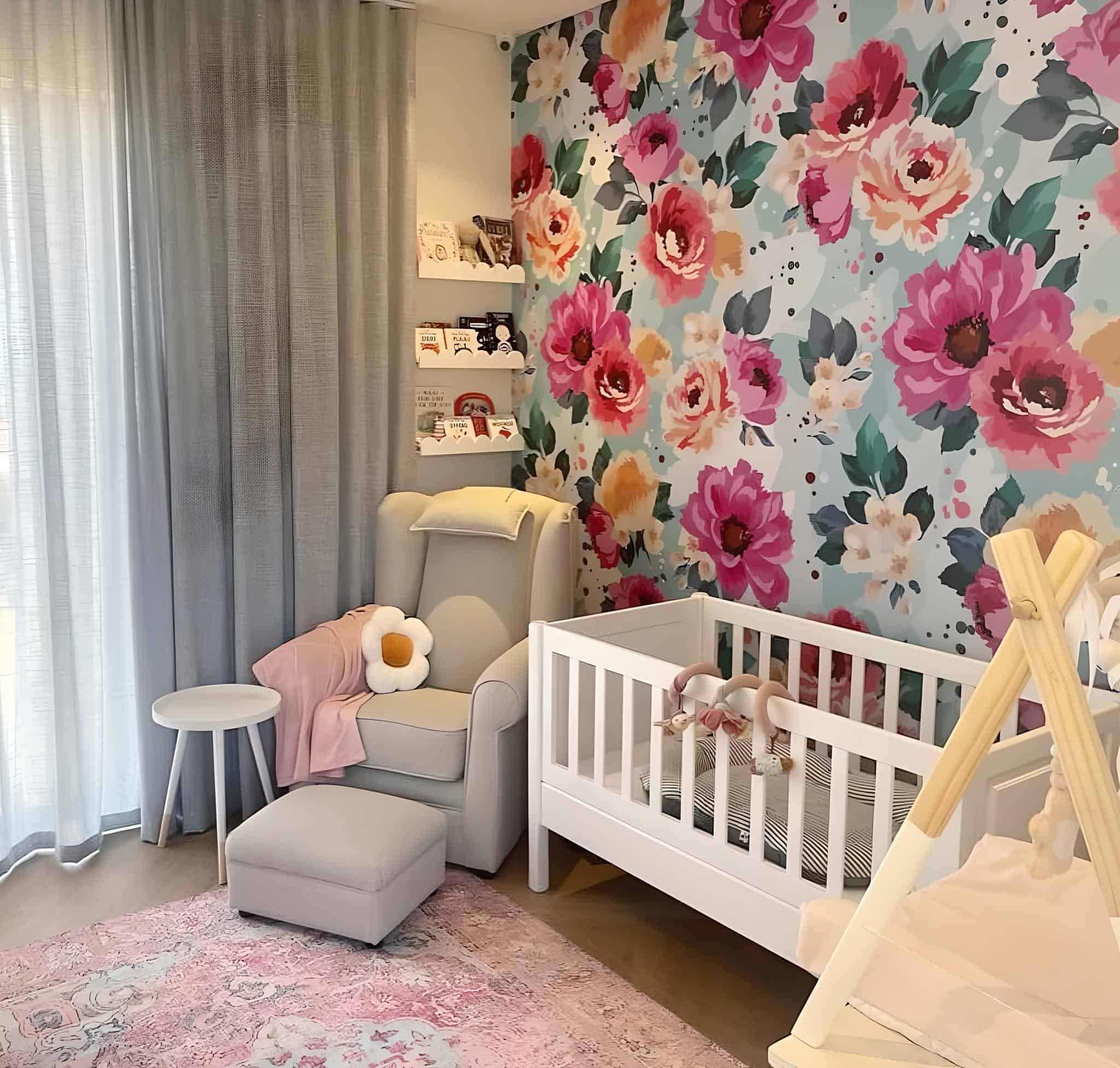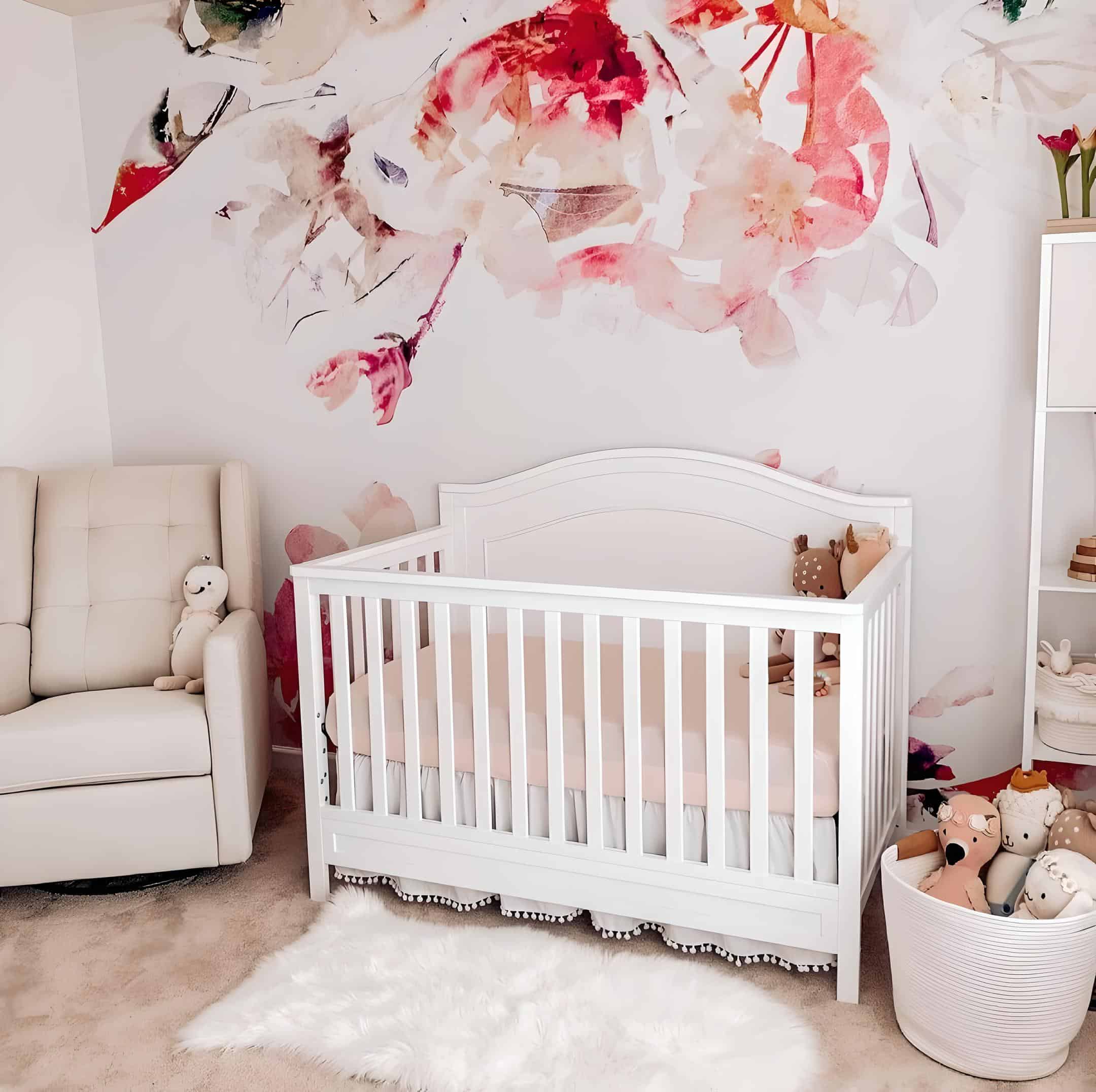 The abundance of floral mural options is precisely why floral nursery ideas captivate expecting parents. With a myriad of choices in colors and textures, selecting the perfect mural becomes a delightful task. In this nursery, a delicate watercolor floral mural in soft pastel blues and pinks creates a tranquil atmosphere. Another cherished feature is the white crib, offering a timeless contrast against the vibrant floral backdrop.