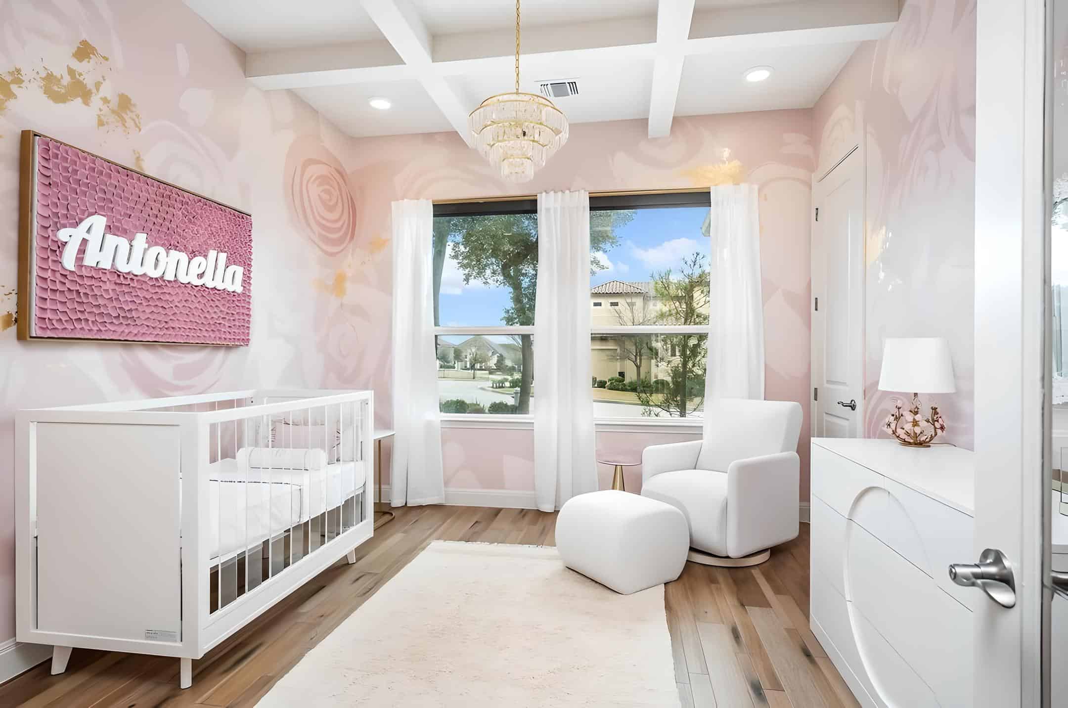 This contemporary nursery seamlessly blends modern sophistication with delicate floral accents. The walls, custom-made by a local mural artist, offer a modern floral design. Alternatively, if you prefer a DIY approach, here are the stencils for you to create your own masterpiece. A luxurious chandelier casts a soft glow, adding a touch of opulence to the space. The choice of elegant white furniture complements the modern aesthetic flawlessly. A standout feature is the sleek white acrylic crib, epitomizing modernity and style. Above the crib, a stunning floral petal canvas completes the scene, ensuring that little Antonella is welcomed into a nursery of unparalleled design and beauty.”