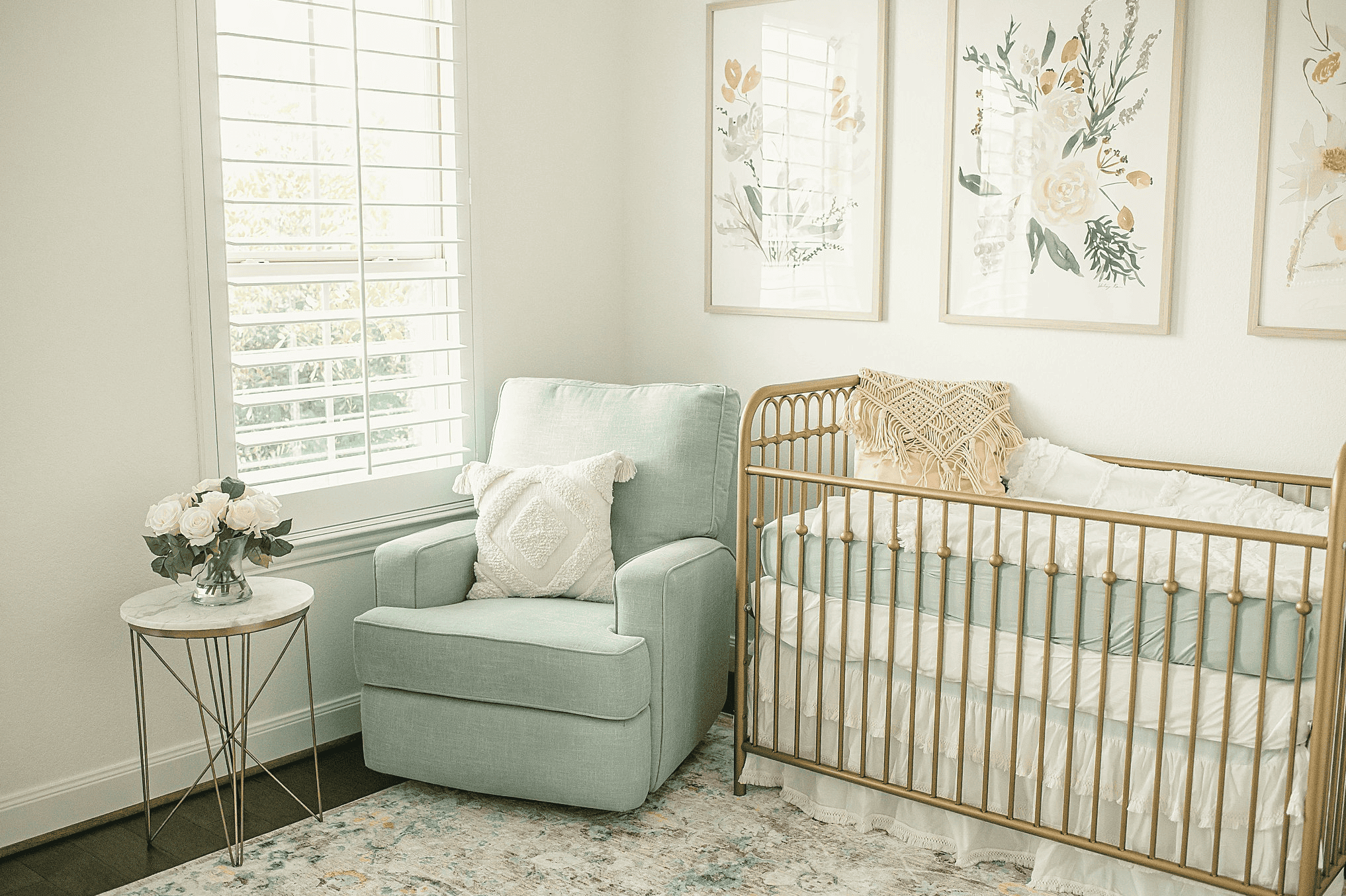 This charming nursery exudes elegance with its incorporation of soothing mint green tones, notably showcased in the wall canvases adorned with delicate watercolor florals. The glider in matching mint green seamlessly continues the soothing theme throughout the room. Adding a touch of luxury, the striking gold crib commands attention, yet harmonizes effortlessly with the overall aesthetic.