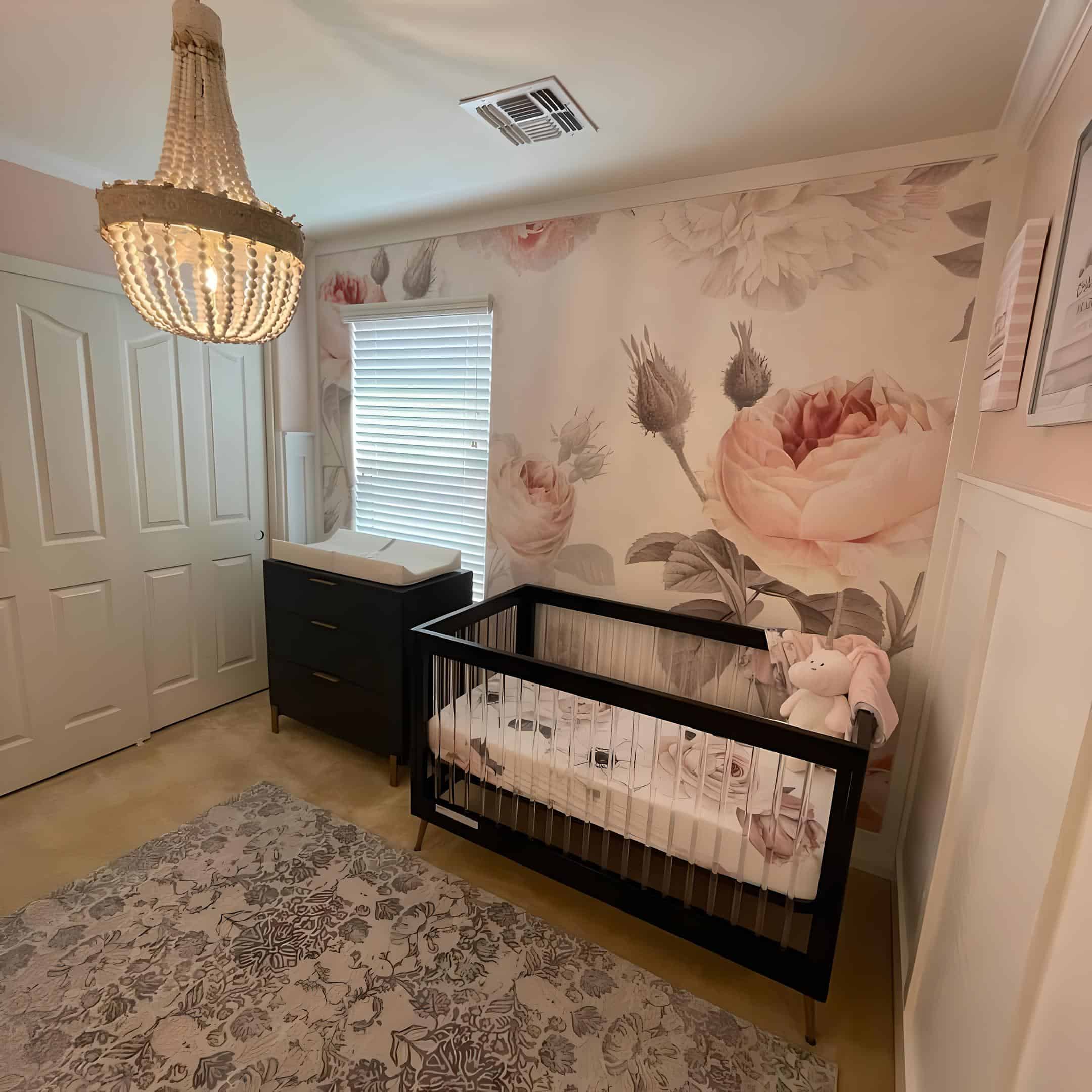 It’s always a delight when parents embrace bold furniture choices like this sleek black acrylic crib and changing table. The elegance of these pieces truly stands out, especially against the backdrop of the stunning blush pink roses mural. Completing the look, the floral rug with its black floral pattern adds a perfect finishing touch to the room.
