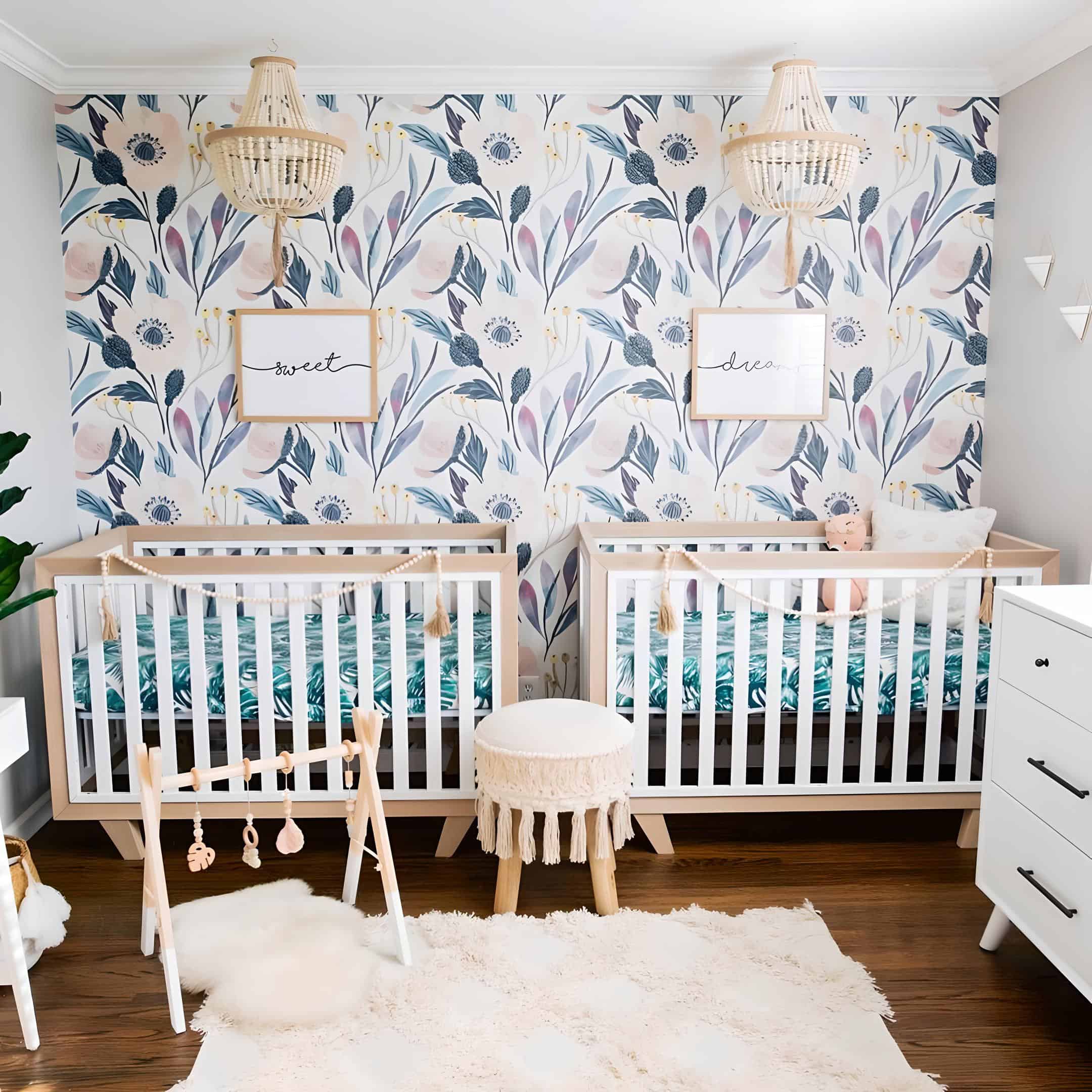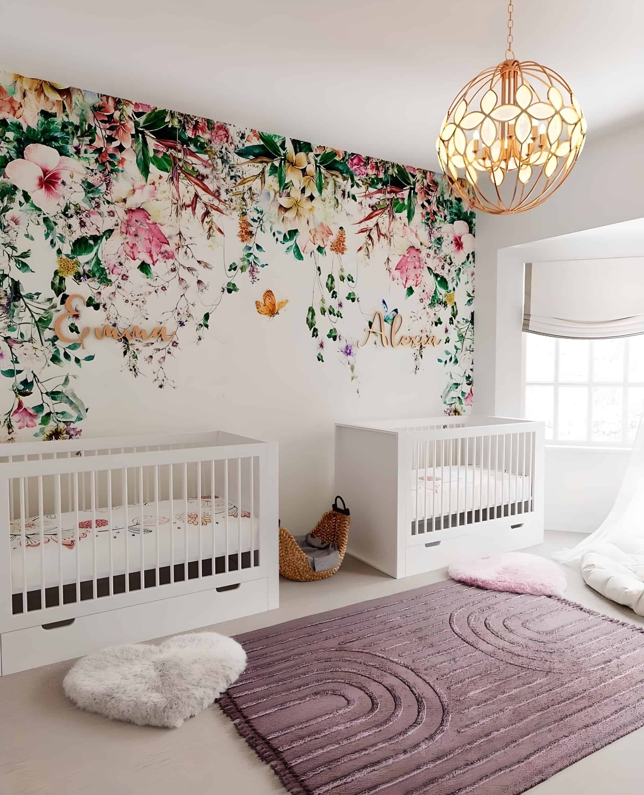 In search of floral nursery ideas for twins? Look no further! This stunning and distinctive nursery showcases a lively floral decal stretching from the back wall, cascading down to the middle where two wooden name signs are delicately positioned above each crib for the twin baby girls. The vibrant florals infuse the nursery with an exuberant energy, creating a space filled with life and joy.