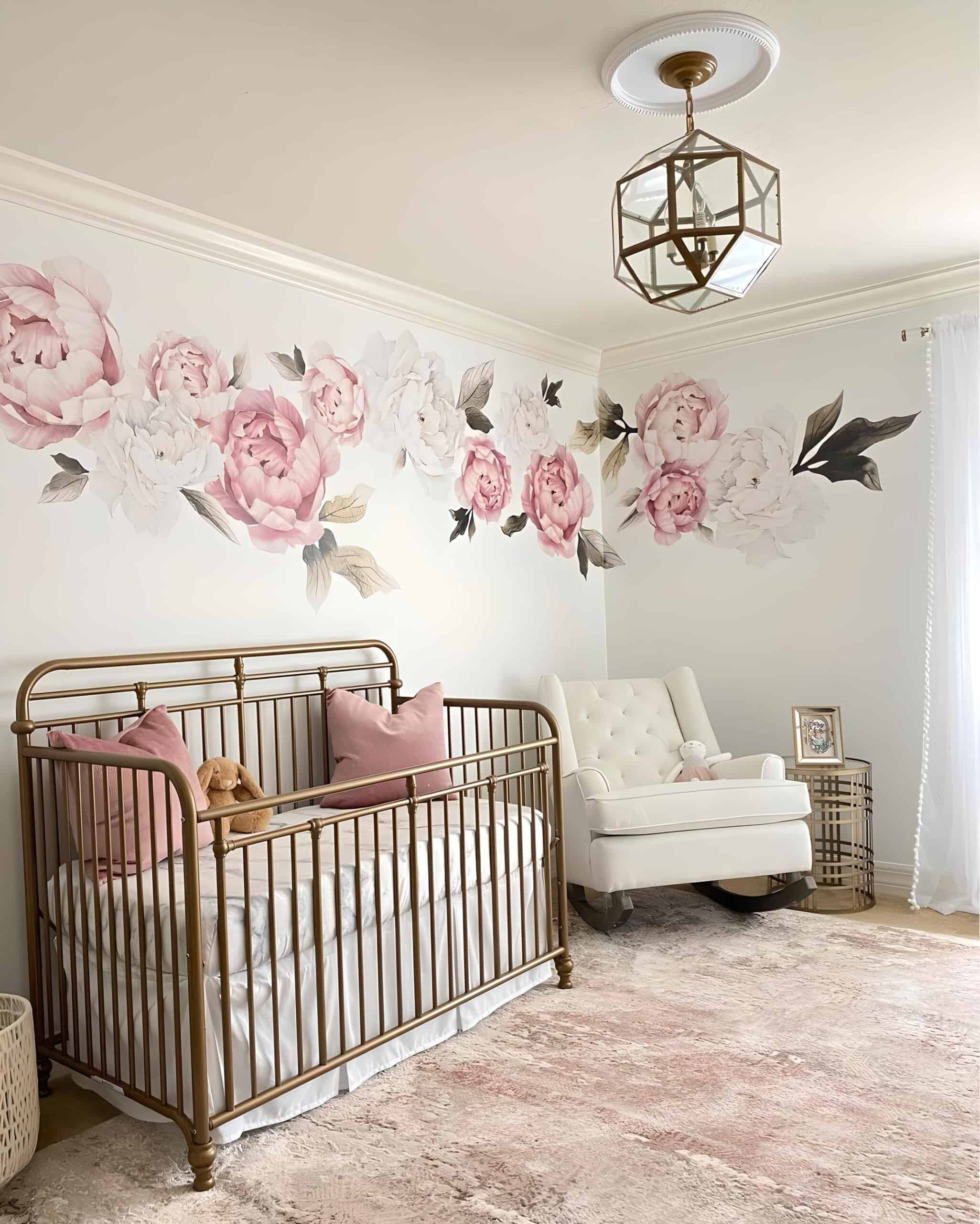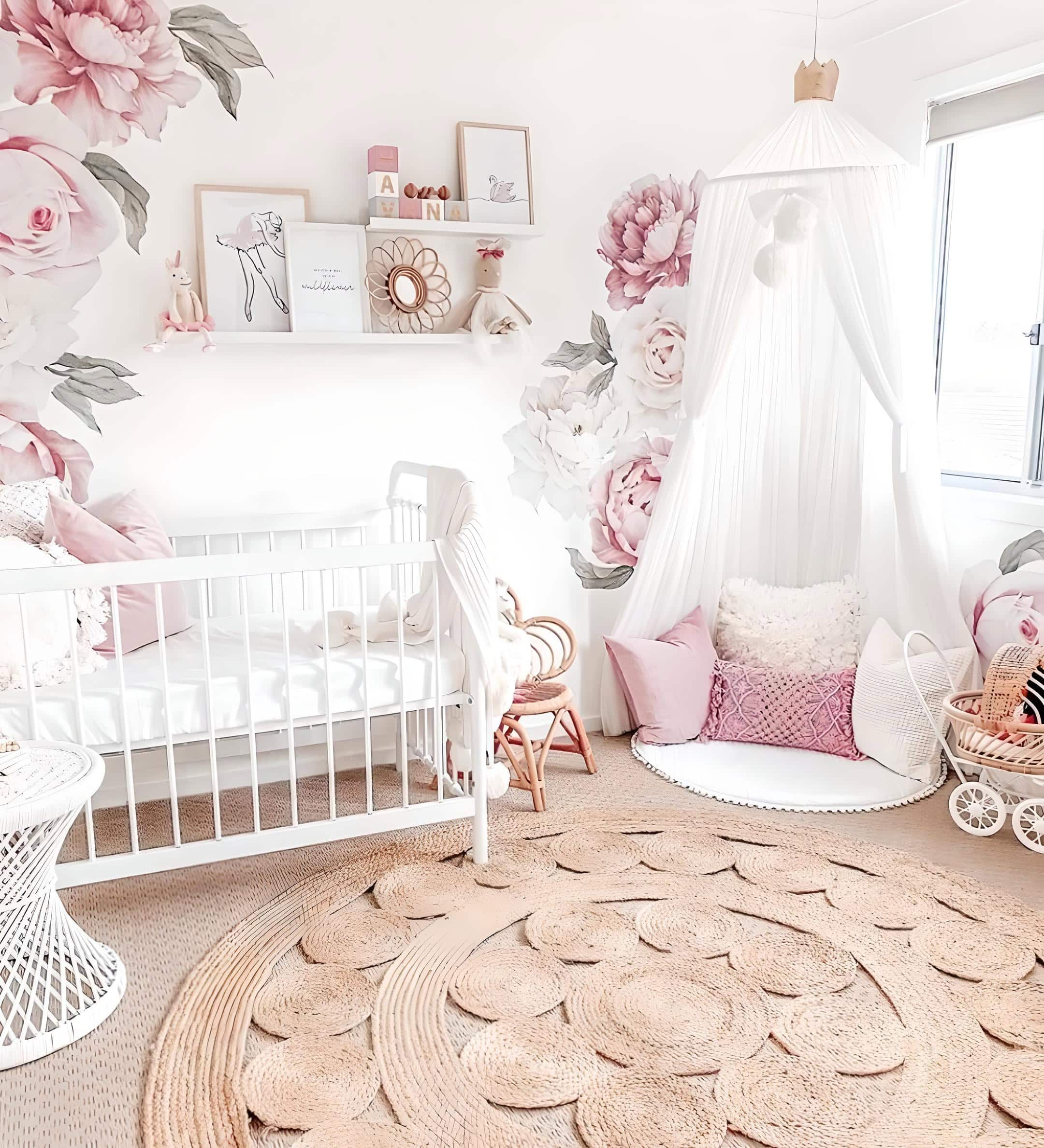 Peony decals have garnered immense popularity within floral nurseries for their versatility. They can be placed anywhere on the walls, and in some cases, even on ceilings, making them a favorite choice. In this nursery, we admire how the decals adorn each opposite corner of the room. One sits to the top left of the crib, while the other graces the opposite corner behind the cozy canopy, adorned with delightful pillows.