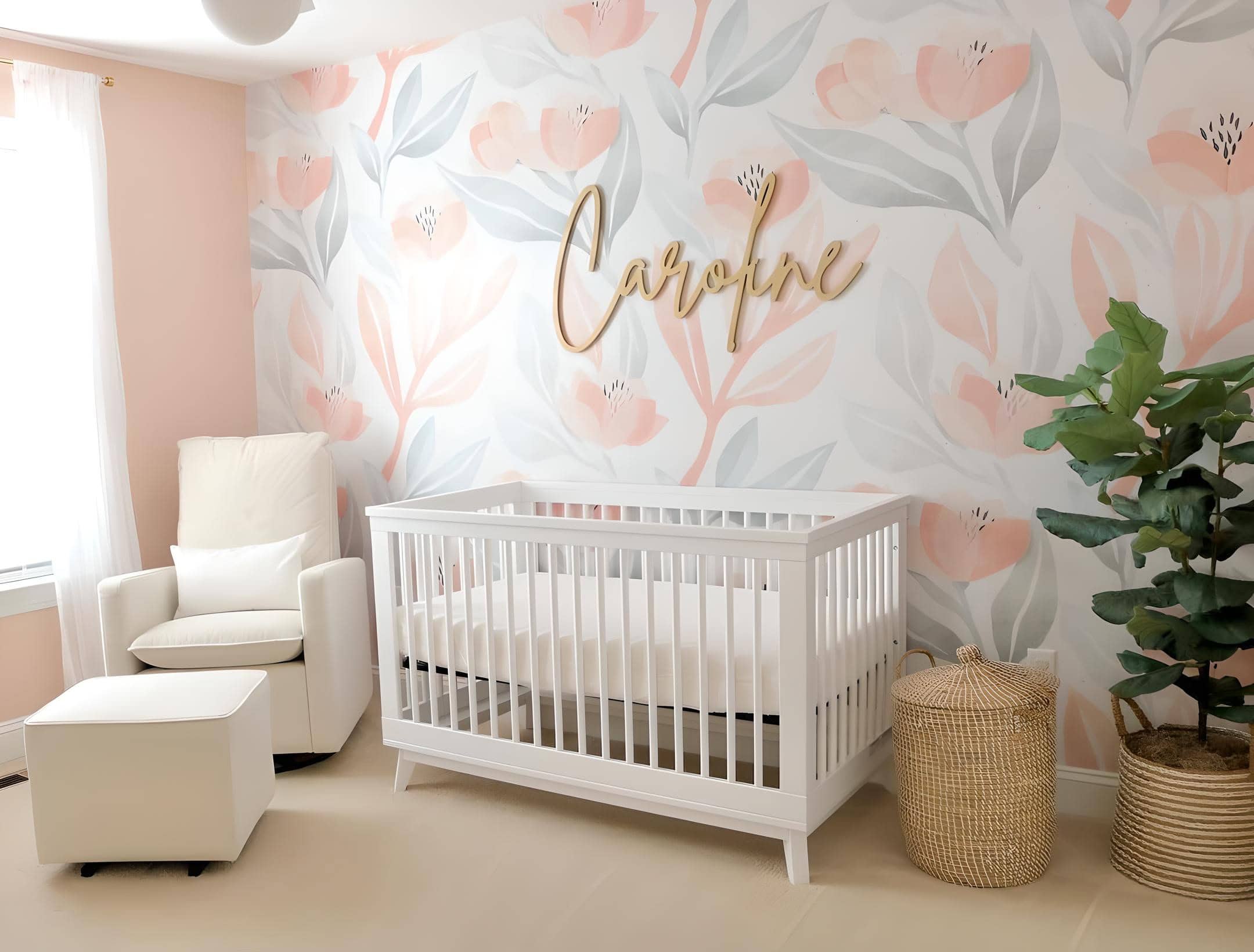 Peach pastels, akin to the beloved pink blush palette, are a favored choice for baby girl floral nurseries. However, peach hues offer a unique touch, evoking a gentle, calming harmony when paired with white or natural wood furniture. This nursery perfectly embodies that sentiment, with a beautiful white crib and beige glider complementing the stunning floral peach and gray mural. The addition of a woven basket next to the fiddle leaf tree adds a charming finishing touch to the space.