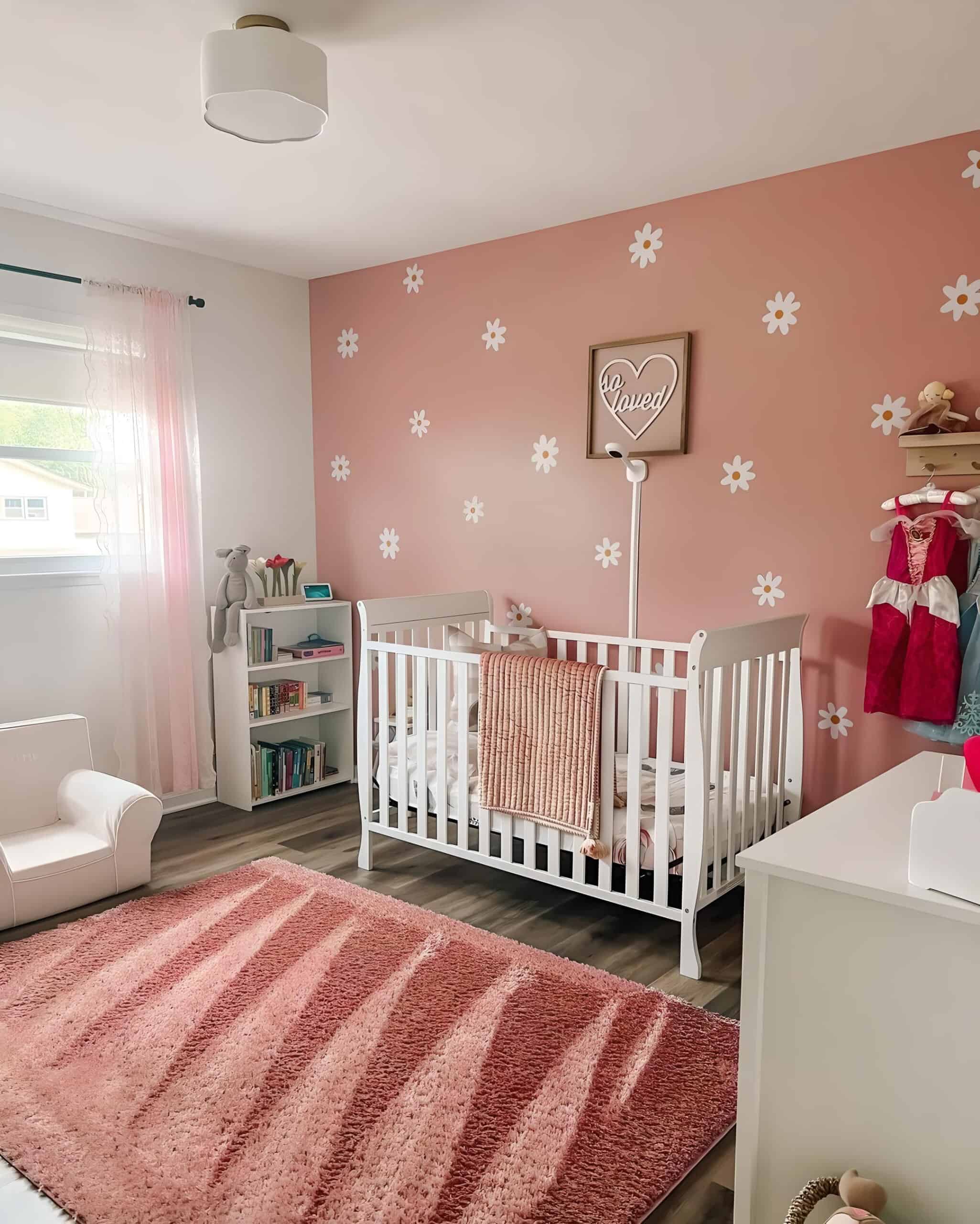 Among the myriad options in floral decals, daisies are swiftly gaining popularity among parents. These versatile yet elegantly simple decals inject personality into the nursery. We admire the way this particular nursery showcases daisies against a warm toasted mauve wall, adding a charming touch to the space.