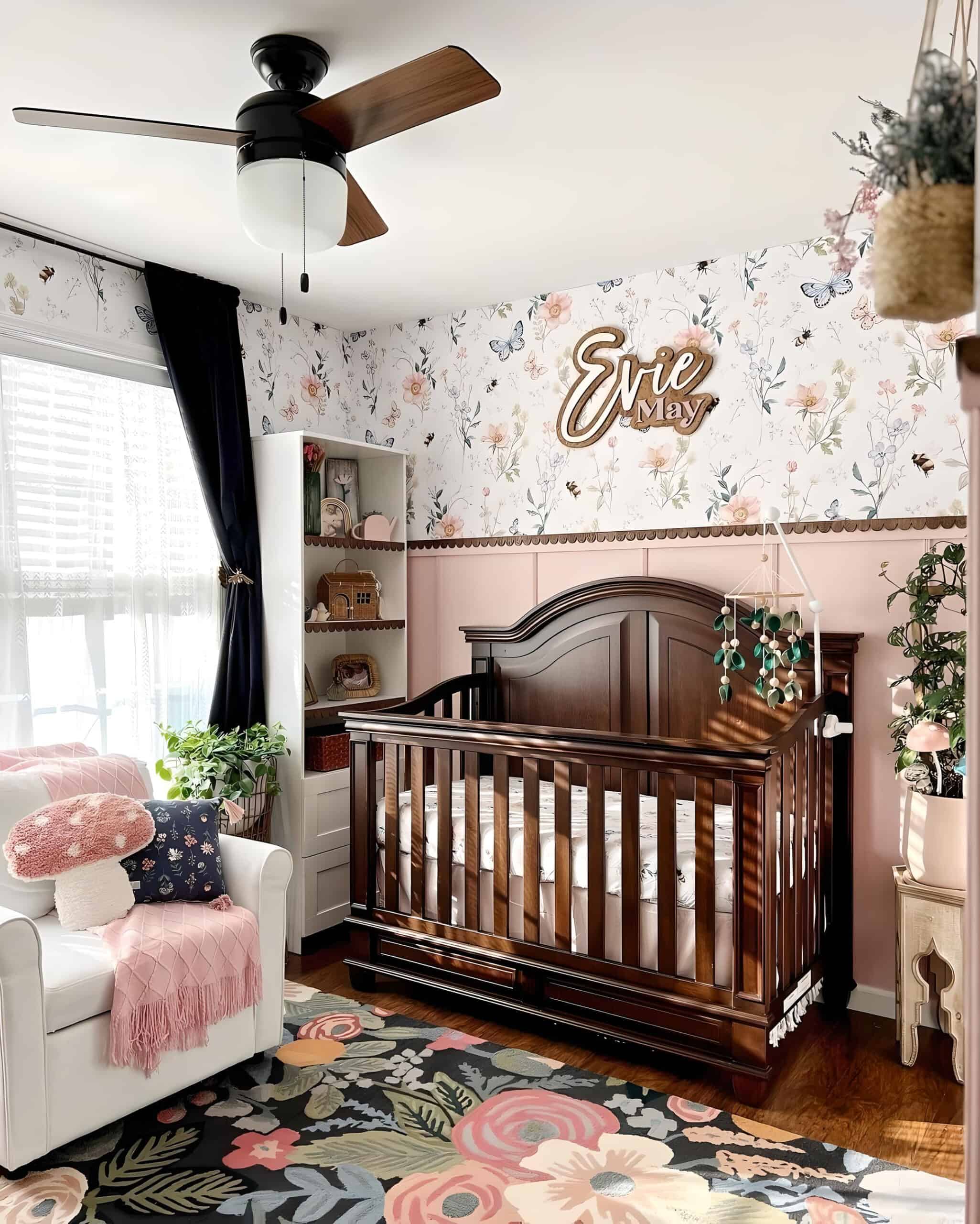 This nursery exemplifies how brown furniture can beautifully complement florals, creating a cozy and welcoming space. The espresso crib is a standout feature, and the custom name sign, stained in the same wood color, maintains a cohesive look. The floral and butterfly mural above the blush pink panels seamlessly blends with the other pink and dark elements in the nursery. Adding to the charm is the floral rug with vibrant flowers on a navy blue base. The adorable pillows, like the pink mushroom, and the throw, contribute to completing the overall look.