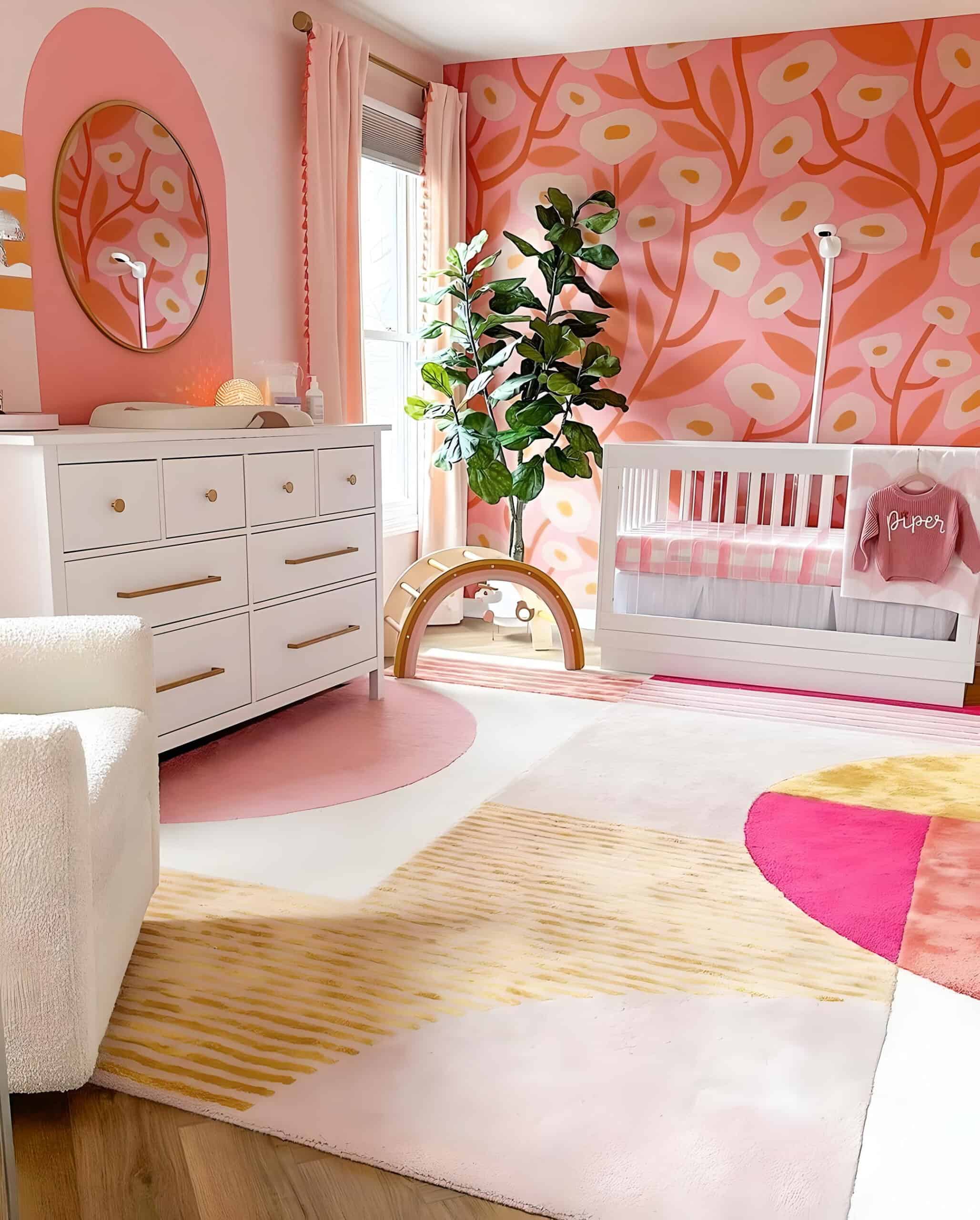 Concluding our roundup is this stunning floral nursery, bursting with eclectic charm and vibrant hues. The design intricacies are simply captivating, from the lively floral mural adorned with abstract white flowers and orange stems against a pink backdrop to the choice of a white acrylic crib, perfectly complemented by the selection of white furniture throughout the room. A pink accent arch painted behind the white dresser adds an extra pop, enhancing the mirror’s presence. The same patterns continue on the colorful, lively rug, showcasing geometric shapes and arches. Every aspect of this room is a sensory delight.