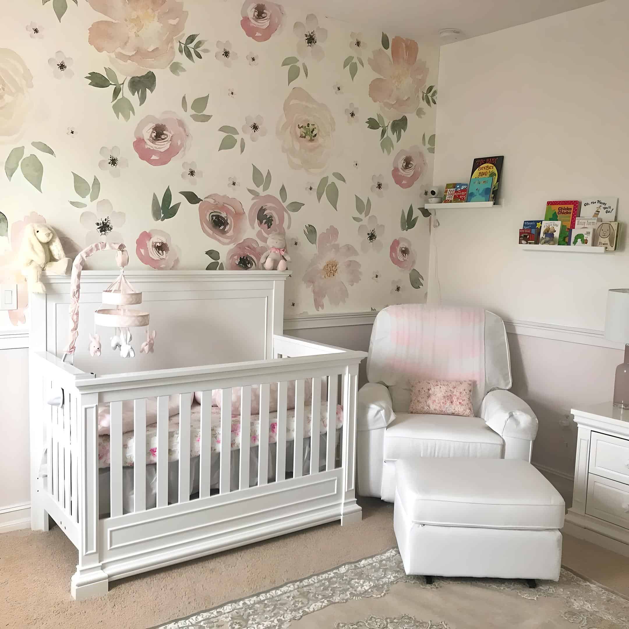 In this classic baby girl nursery, a white panel crib takes center stage, with vibrant watercolor florals adorning the wall behind it. Situated next to the crib is a cozy glider and ottoman, providing a comfortable spot for soothing moments. Bookshelves adorn the walls alongside the glider, adding both functionality and decorative charm to the space.