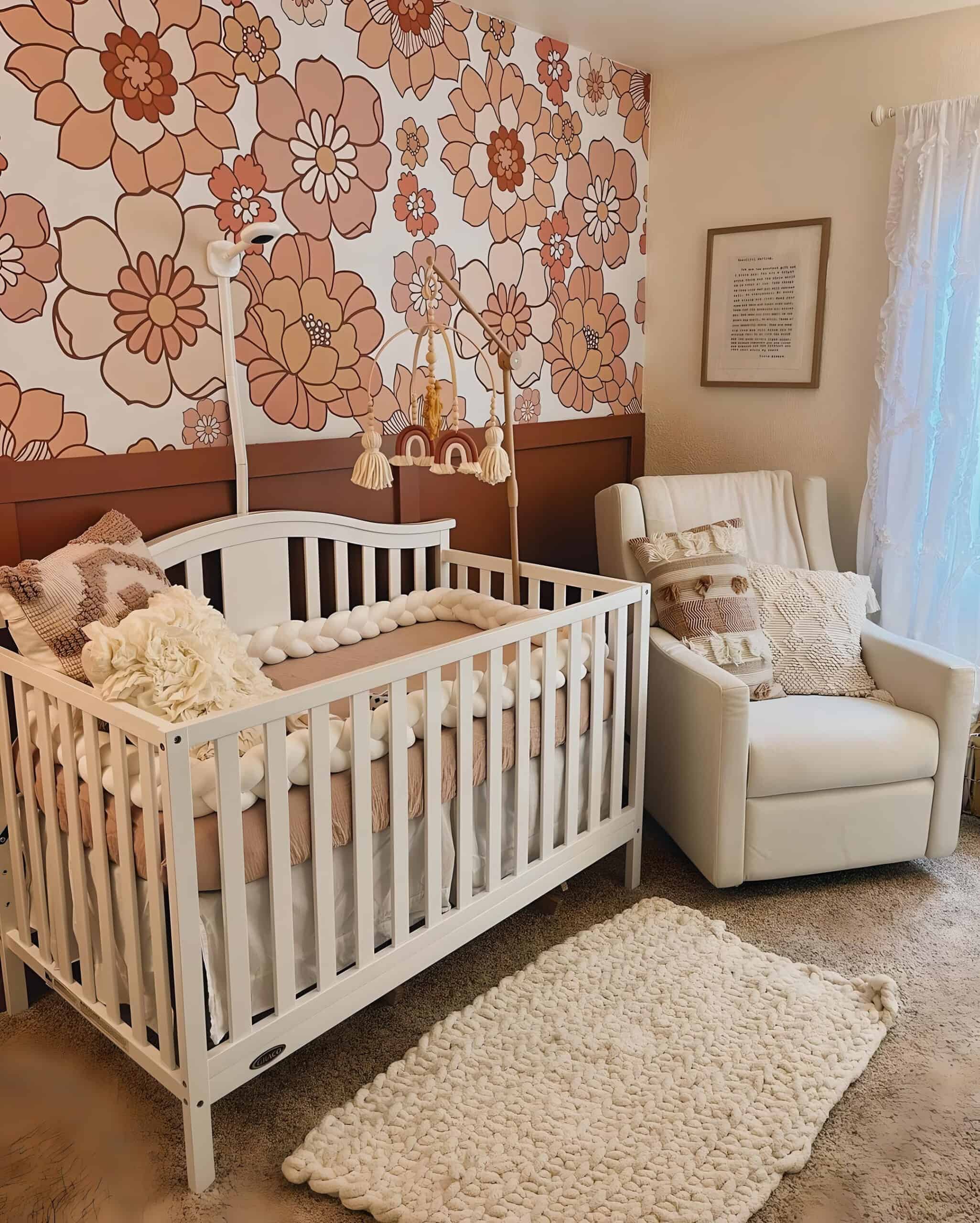 While reminiscent of the previous nursery, this one distinguishes itself with a sleek, dark wood crib boasting a mid-century design. Against a soft pastel peach accent wall, floral decals bloom, infusing the space with a gentle charm. Above the crib, two frames adorned with touching quotes introduce a modern touch. A timeless choice, the oriental rug graces the floor, its hues of pink and brown seamlessly tying into the crib’s rich brown tones, completing the harmonious ensemble.
