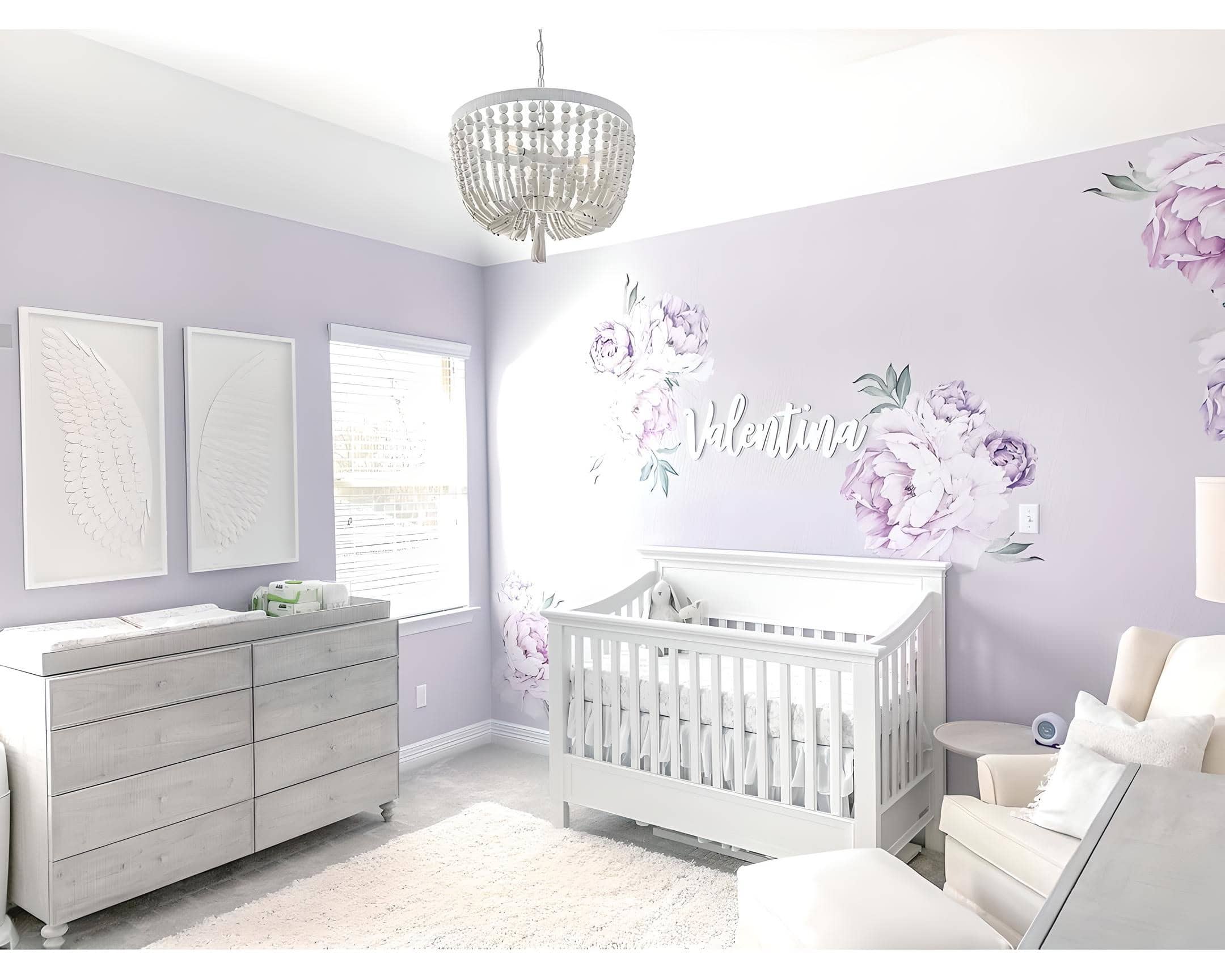 Amidst a sea of pink floral nursery ideas in this roundup, this lavender nursery offers a refreshing change of pace. The soothing lavender walls set a serene tone, while the purple and white peony decals add a lovely touch. The choice of white and gray furniture perfectly complements the overall aesthetic.