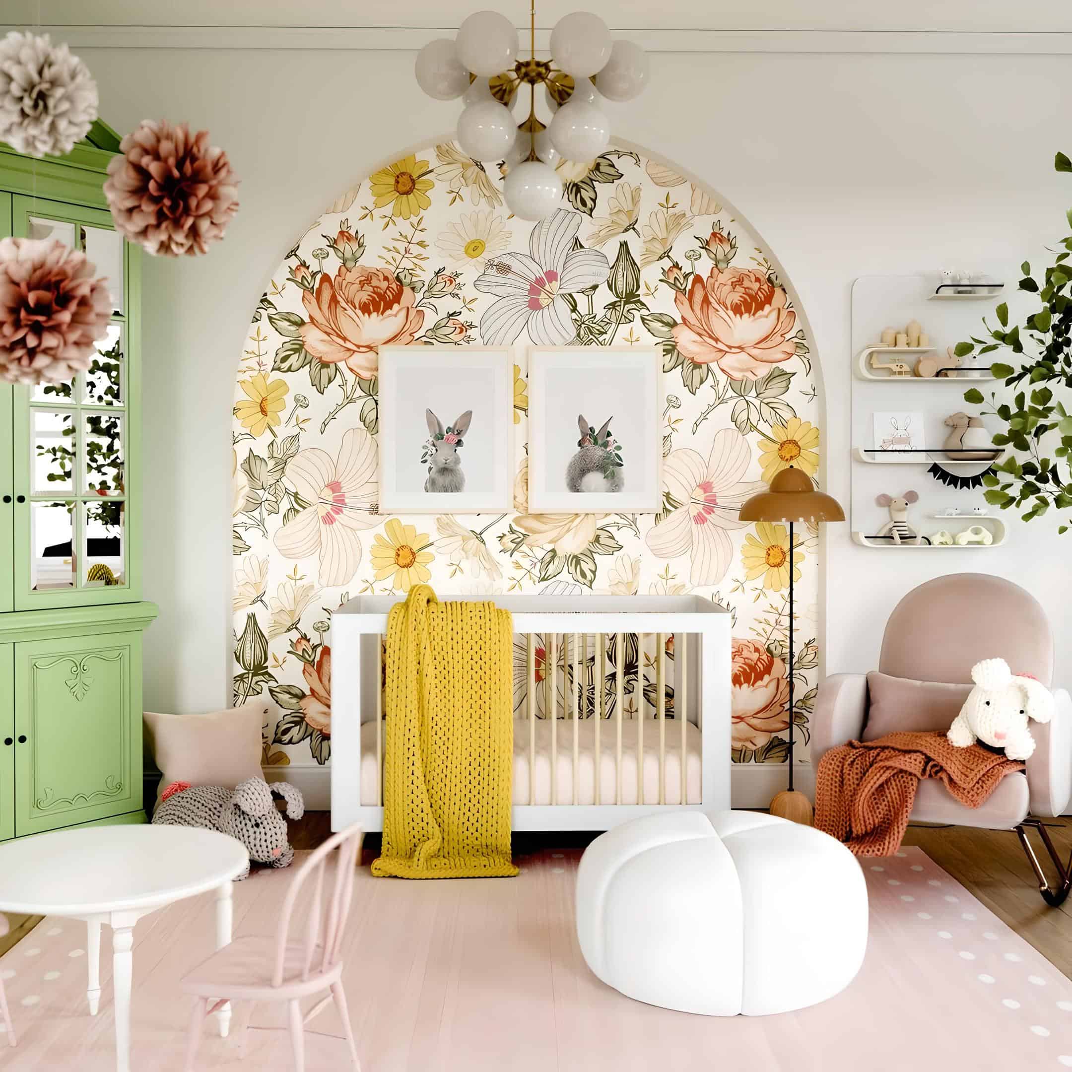 In this eclectic nursery, a vibrant palette of colors awaits to captivate your baby’s senses. The stunning floral pattern mural finds its perfect placement within the arched wall, infusing the space with botanical charm. Above the crib, a rabbit canvas art set enhances the springtime atmosphere of the nursery. The armoire in a lively green hue harmonizes beautifully with the greenery depicted in the mural. A pink modern rocker and rug complement the pink flowers in the mural, adding to the cohesive design. Completing the eclectic vibe, midcentury lighting fixtures illuminate the nursery with timeless elegance.