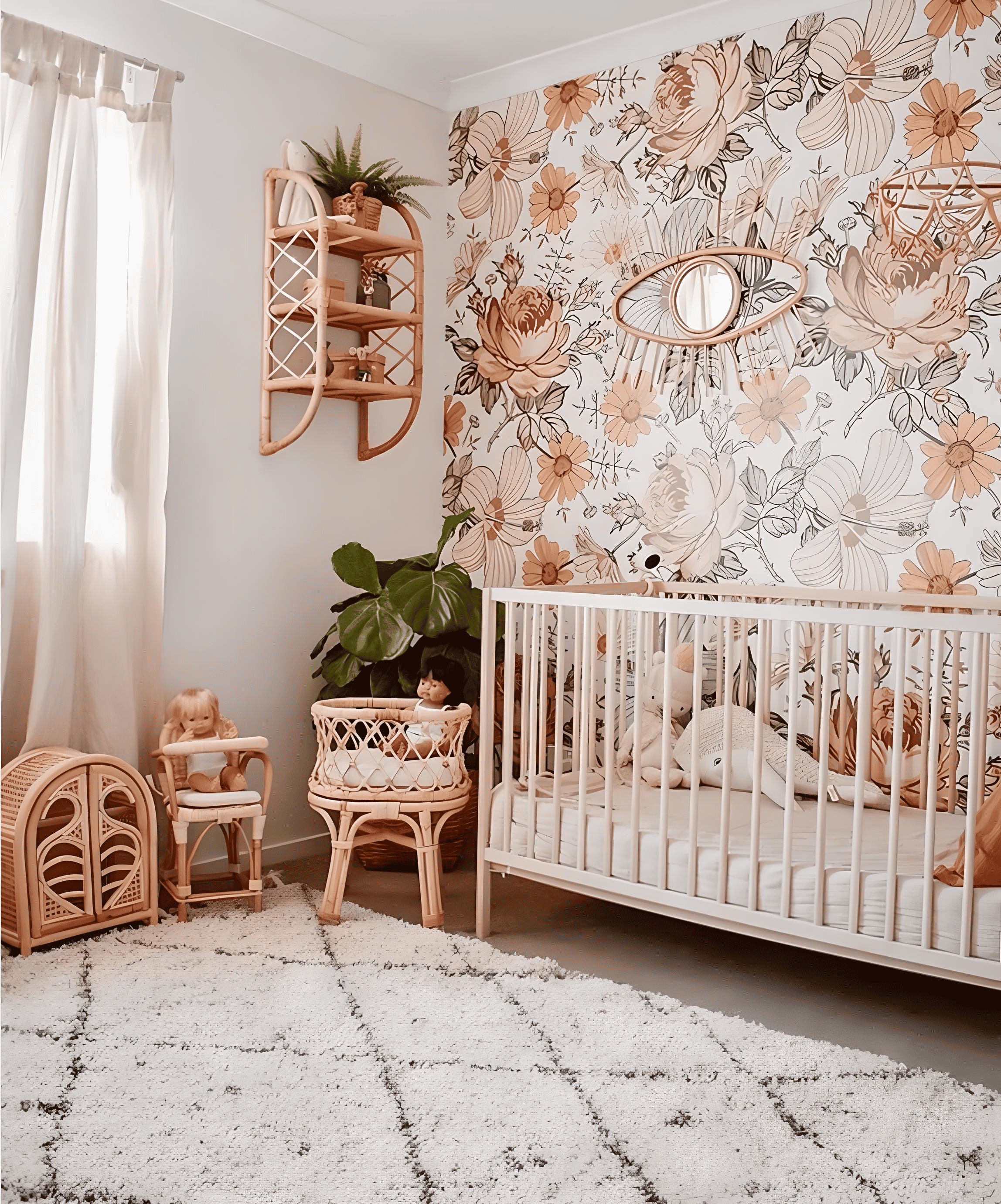 Step into this boho nursery, where a floral wallpaper in oranges and earth tones sets a serene backdrop. The natural wood crib beckons peaceful rest, while rattan decor elements, like wall shelves and woven toys, add artisanal charm. Above, a rattan evil eye mirror safeguards baby against negativity, completing this enchanting boho floral dream.